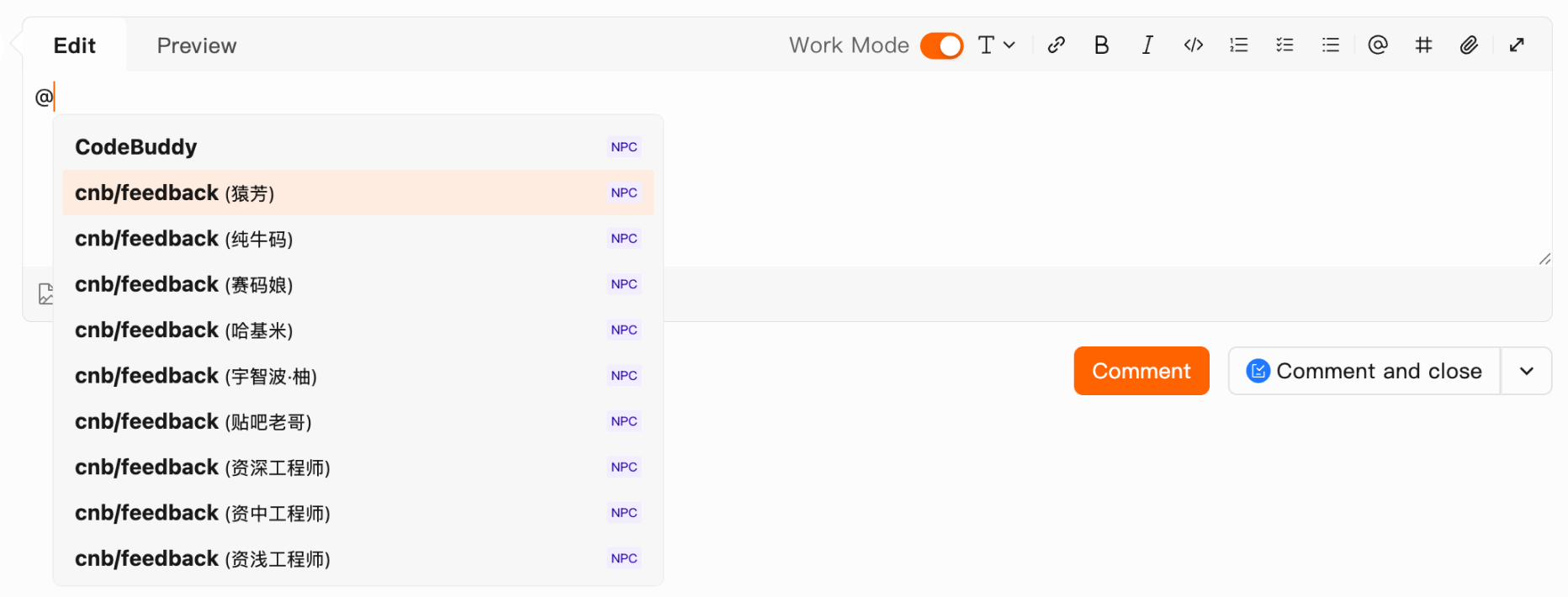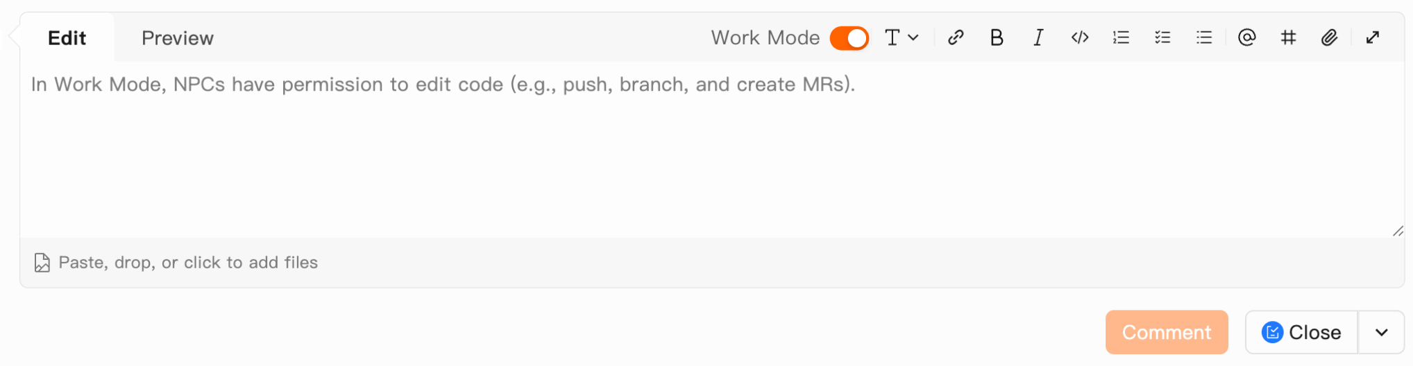 Users with Repository Developer permissions or higher can enable Work Mode via the checkbox in the comment area. Once enabled, the NPC operates with code editing permissions, capable of actions such as pushing code, creating branches, and submitting merge requests.
