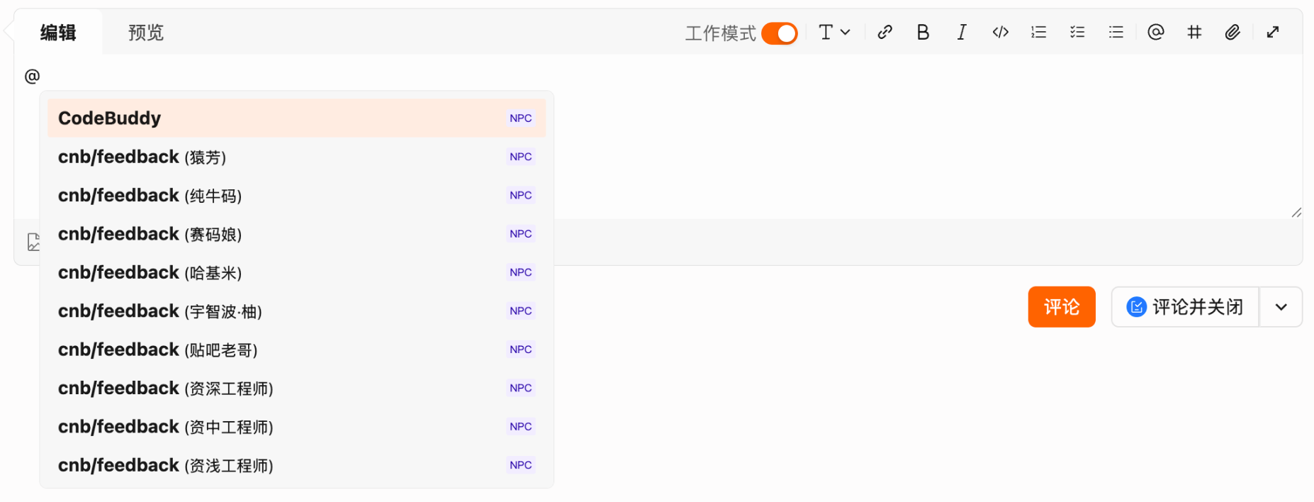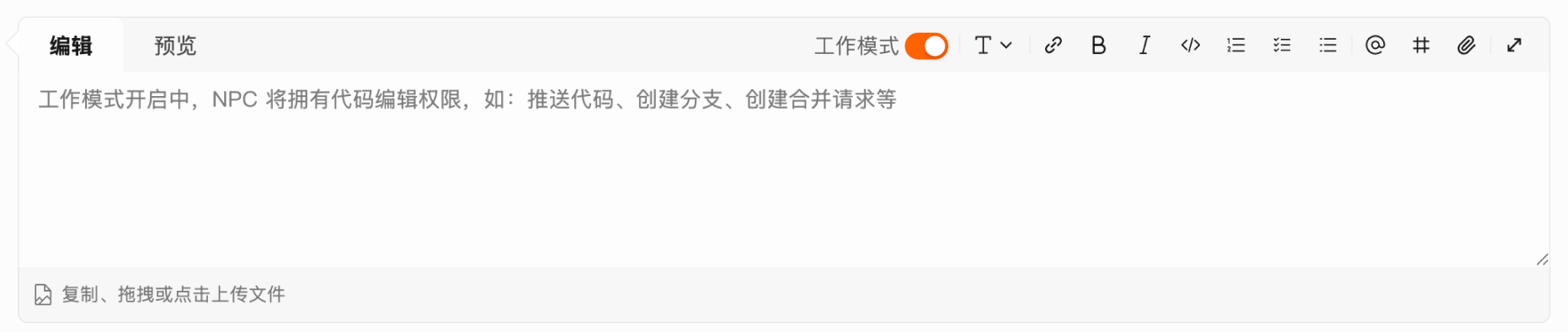 可在评论区勾选开启工作模式(仓库开发者及以上权限),开启后,工作模式下的 NPC 将拥有代码编辑权限,如:推送代码、创建分支、创建合并请求等