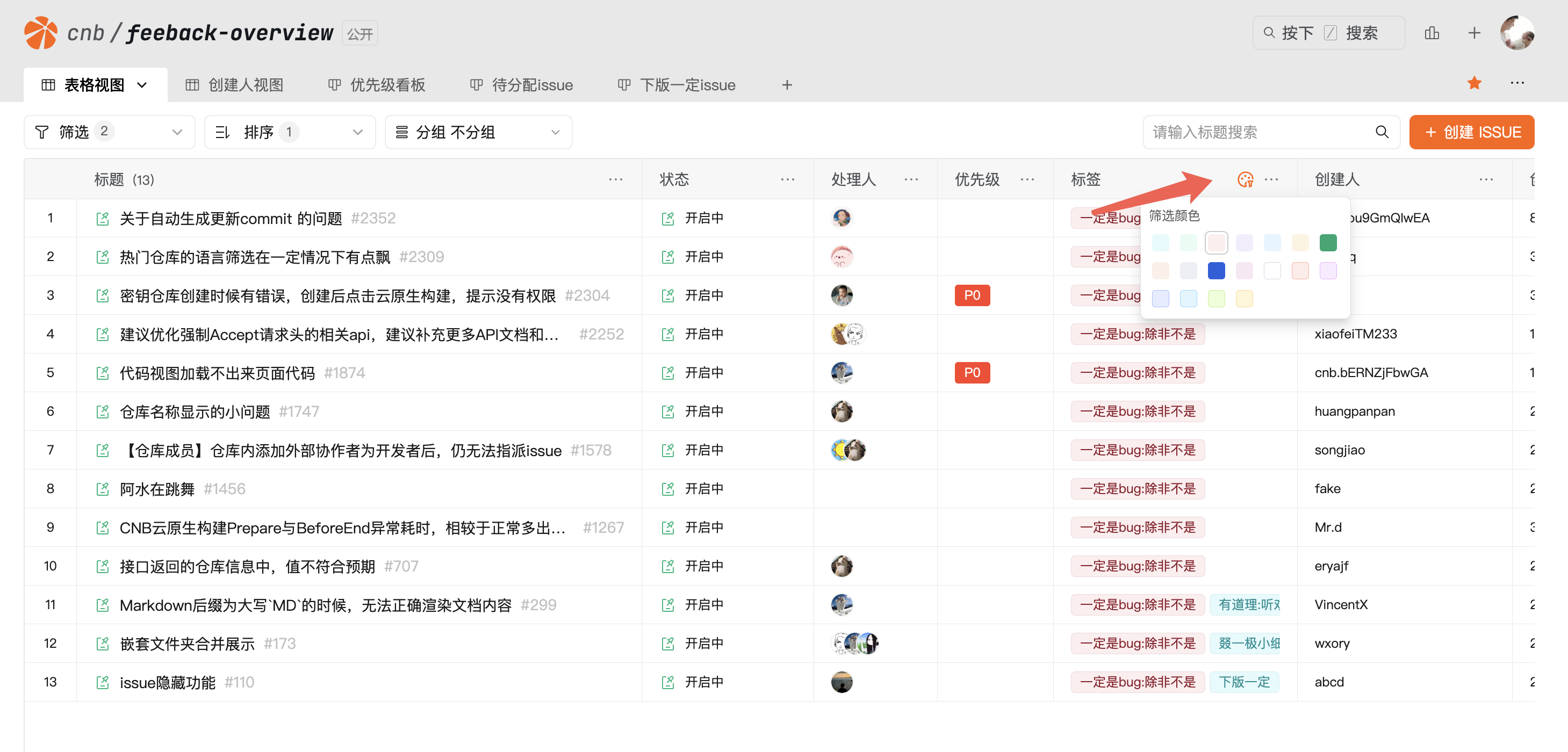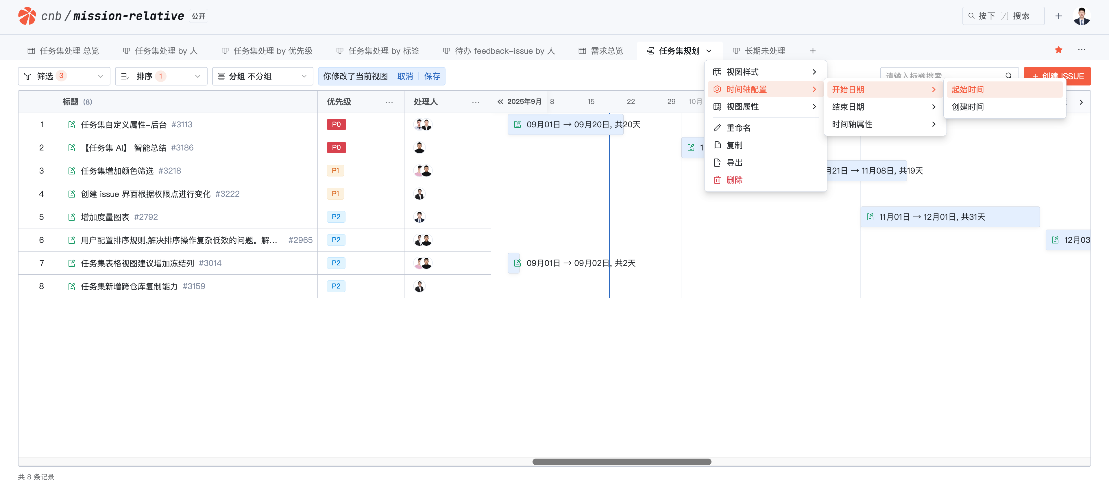 自由创建/切换表格视图、看板视图、甘特视图,以不同视角管理 Issue/PR。