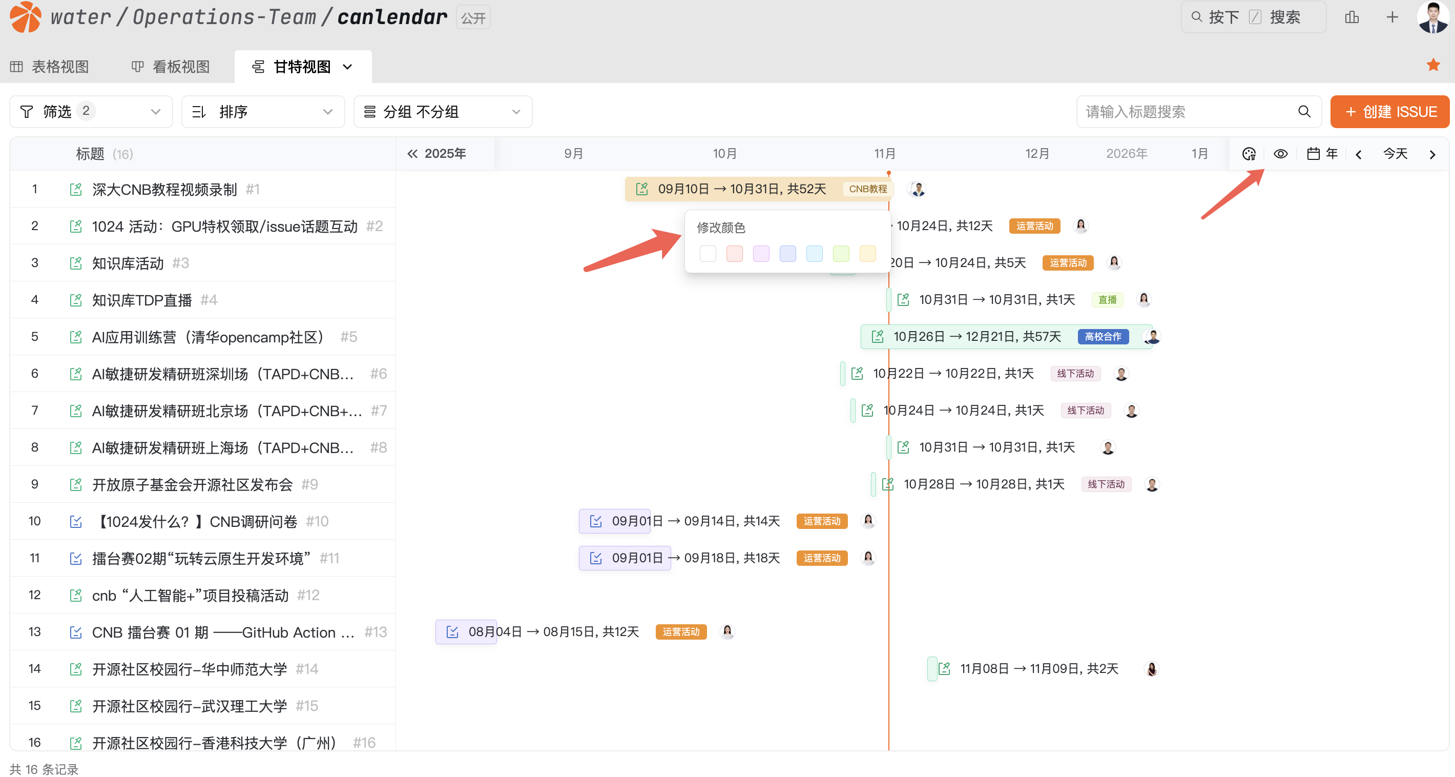 甘特视图可修改时间轴颜色,也可进行颜色筛选、隐藏时间轴文字等,满足各种玩法