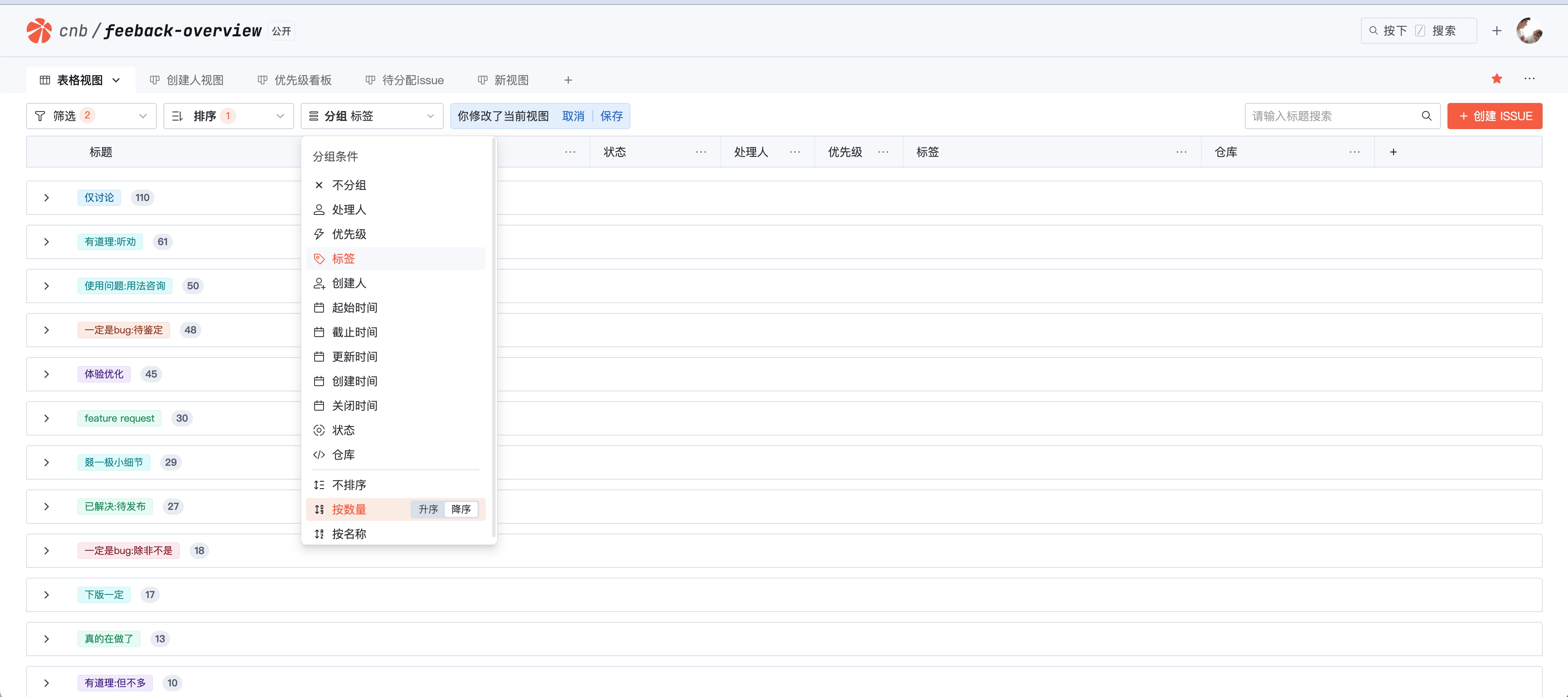 视图分组后可以按数量/按名称进行升序/降序,提升可见性